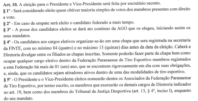 O Presidente da FEDERAÇÃO PARANAENSE DE TIRO ESPORTIVO, pessoa jurídica de direito privado, inscrita no CNPJ sob nº 75.158.204/0001-54, com sede na Rua Saldanha Marinho, 1361 – 2º Andar, Centro, Guarapuava, Estado do Paraná, CEP 85010-290, Sr. ACIR MORES EDLING, no uso de suas atribuições e com fulcro nos artigos 10º § 1º ao 5º do Estatuto, convoca os clubes filiados para participarem da ASSEMBLÉIA GERAL ORDINÁRIA, que será realizada, no dia 08/11/2025, ás 16h30min em primeira convocação com maioria absoluta dos filiados ou as 17h em segunda chamada com número superior a 1/3 (um terço) dos filiados, no auditório do Hotel Royal Trip, localizado na Rua São Paulo, nº 531, Bairro Dos Estados, Guarapuava/PR, quando será discutida e votada a seguinte ordem do dia: